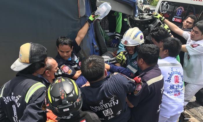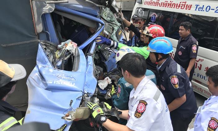 สิบล้อชนซ้ำซ้อน-เสยรถพ่วงคันหน้า ก่อนอีกคันตามหลังพุ่งชนท้ายอีก โชเฟอร์เจ็บติดคาคอนโซล