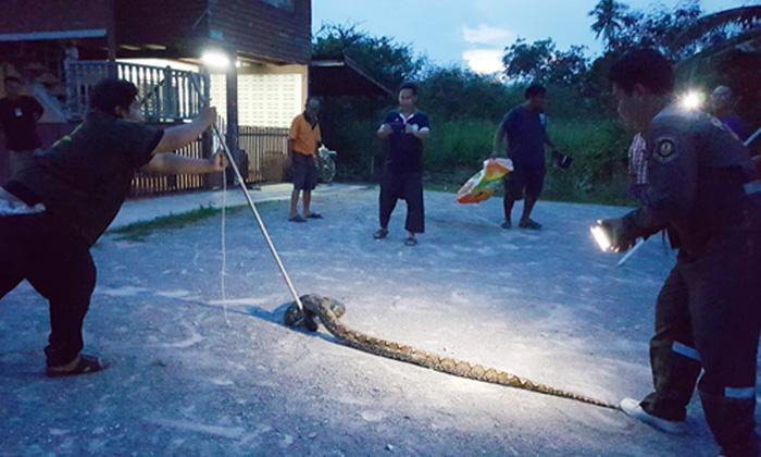 “เหลือมตัวเขื่อง” เลื้อยซุกบ้านคนก่อนเขมือบลูกหมาอิ่มแปล้-กู้ภัยเร่งจับปล่อยป่าลุ้นระทึก กู้ภัยเร่งจับงูเหลือมยาวกว่า 4 เมตร หนักกว่า 50 กก. ขดตัวซ่อนในบ้าน ขณะที่เจ้าของพบ ลูกหมาหายไป 1 ตัว คาดถูกเขมือบไปแล้ว