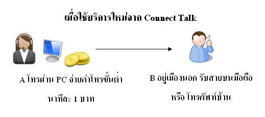 บริการ Connect Talk เพิ่มรูปแบบความประหยัดให้คนอยู่เมืองไทย โทรไปต่างประเทศจากคอมพิวเตอร์ในราคาประหยัดสุดๆ1 บาท/นาที ตลอด 24 ชม. ถึง9 ประเทศดัง คือ อเมริกา, แคนนาดา, ออสเตรเลีย, อังกฤษ, จีน, ฝรั่งเศส, เยอร์มัน, ฮ่องกง, สิงคโปร์ และนอกจากนี้ คุณ ยังโทรไปประเทศอื่นๆ ในราคาสุดประหยัดอีกกว่า 200 ประเทศ เพิ่มเติม www.connecttalk.com