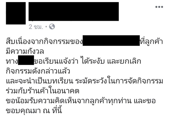 อย่างไรก็ตาม หลังจากกระแสวิจารณ์ดังกล่าวมีเข้ามาอย่างล้นหลาม ทำให้ซูเปอร์มาร์เก็ตแห่งนี้ โพสต์ยุติการจัดกิจกรรมแจกสุนัขเป็นของรางวัล เมื่อเวลาประมาณ 18.00 น. วันนี้ (26 มี.ค.) และจะระมัดระวังในการจัดกิจกรรมต่างๆ ให้มากขึ้น