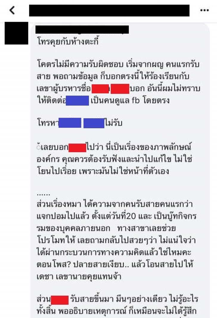 นอกจากนี้ ชาวเน็ตคนหนึ่งอ้างว่า ตนโทรศัพท์ไปร้องเรียนเรื่องนี้ต่อซูเปอร์มาร์เก็ตสาขาดังกล่าว แต่ปลายสาย ซึ่งเป็นผู้หญิง โอนให้คุยกับเลขาผู้บริหารสาขา แต่เลขารายนี้ โยนเรื่องให้ไปติดต่อผู้ดูแลเพจ ซึ่งผู้ดูแลเพจโยนเรื่องกลับมาให้เลขาผู้บริหารอีกที