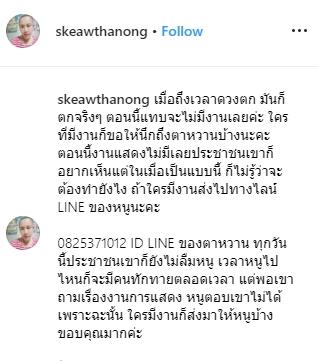 "เมื่อถึงเวลาดวงตก มันก็ตกจริงๆ ตอนนี้แทบจะไม่มีงานเลยค่ะ ใครที่มีงานก็ขอให้นึกถึงตาหวานบ้างนะคะ ตอนนี้งานแสดงไม่มีเลยประชาชนเขาก็อยากเห็นแต่ในเมื่อเป็นแบบนี้ ก็ไม่รู้ว่าจะต้องทำยังไง ถ้าใครมีงานส่งไปทางไลน์ LINE ของหนูนะคะ 0825371012 ID LINE ของตาหวาน"