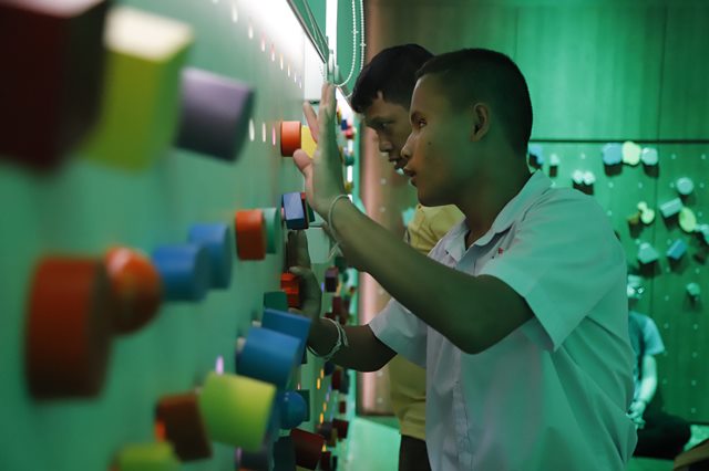 ตัวห้องเรียนที่ออกแบบนั้น ทางผู้อำนวยการได้เลือกห้องสมุดที่มีผนัง 6 ด้าน ทางเราใช้ความรู้ด้านการออกแบบผสานกับหลักสูตรพรีเบรลล์ (Pre-Braille) ทำให้ทั้งห้องสามารถใช้เรียนรู้ได้รอบด้าน อันนี้เราก็เริ่มโดยไม่มีโต๊ะ ไม่มีเก้าอี้ แล้วก็มีผนังให้เด็กไปเกาะกับผนัง เล่นกับผนัง หมุด ตัวหมุดก็จะมีหลักสูตรต่างกัน มีอยู่ 6 แบบ ตามผนัง 6 ด้าน ตัวหมุดด้านแรกจะเริ่มที่ระเบียงก่อน ตัวหมุดจะมีขนาดเท่าๆ กัน แล้วก็เป็นรูปทรงมาตรฐาน ทรงกลม ทรงเหลี่ยม สามเหลี่ยม ผนังที่สองก็เป็นเรื่องขนาดเริ่มต่างกัน แล้วก็มีตัวเลขให้นับ ผนังต่อไปก็จะเป็นตัวหมุดมีเสียงอยู่ข้างใน เพราะว่าพอเราเริ่มจากสัมผัสแล้ว เราก็เริ่มพัฒนาสัมผัสอื่นๆ ที่เด็กมีนอกจากการมองเห็น ก็จะมีสัมผัส ได้ยิน ได้กลิ่น แล้วก็เสียงที่เราใช้ในหมุดก็จะเป็นของในชีวิตประจำวัน เช่น เกลือ พริกไทย อันนี้ประหลาดใจมากที่เด็กสามารถเขย่าพริกไทย เขย่าเกลือ แล้วแยกแยะได้ว่ามันไม่เหมือนกัน”