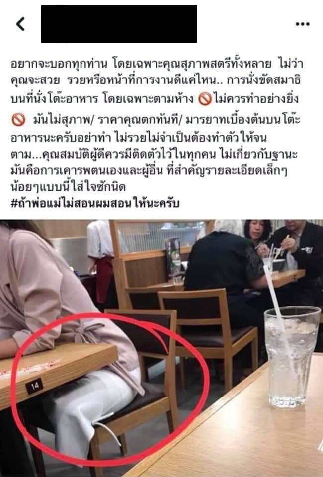 ผู้ใช้เฟซบุ๊กรายหนึ่งโพสต์รูปผู้หญิงคนหนึ่งขณะกำลังรับประทานอาหารในร้าน พร้อมกับวงไปที่ท่านั่ง และเขียนคำบรรยายวิจารณ์ผู้หญิงคนดังกล่าวว่า ท่านั่งกึ่งขัดสมาธิไม่สุภาพ และเป็นการขาดมารยาทบนโต๊ะอาหาร