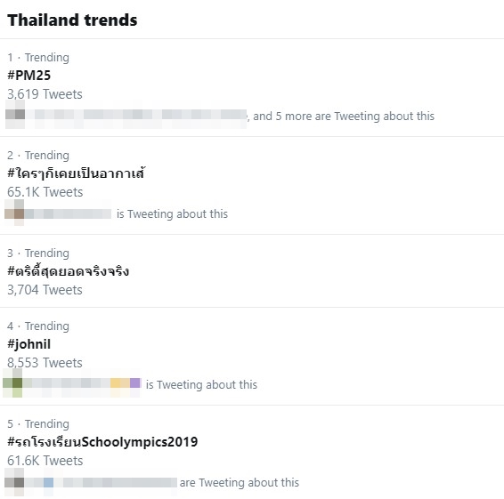 วันนี้ (30 ก.ย.) ทวิตเตอร์ไทยเทรนด์ แฮชแท็ก #PM25 ขึ้นอันดับ 1 หลังจาก กรมควบคุมมลพิษ รายงานสถานการณ์ฝุ่นละอองขนาดเล็กกว่า 2.5 ไมครอน (PM 2.5) ในพื้นที่กรุงเทพมหานครและปริมณฑล เมื่อเวลา 06.00 น. พบปริมาณฝุ่นละออง PM 2.5 ตรวจวัดได้ระหว่าง 42-62 ไมโครกรัมต่อลูกบาศก์เมตร (มคก./ลบ.ม.) เกินเกณฑ์มาตรฐาน 13 พื้นที่ (ค่ามาตรฐานไม่เกิน 50 มคก./ลบ.ม.) ดังนี้
