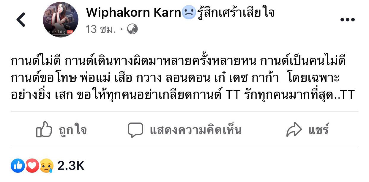 เกิดอะไรขึ้น "กานต์ วิภากร" พรั่งพรู ขอโทษ "เสก โลโซ" และทุกคน ขอแค่อย่าเกลียดกันกานต์ไม่ดี กานต์เดินทางผิดมาหลายครั้งหลายหน กานต์เป็นคนไม่ดี กานต์ขอโทษ พ่อแม่ เสือ กวาง ลอนดอน เก๋ เดช กาก้า