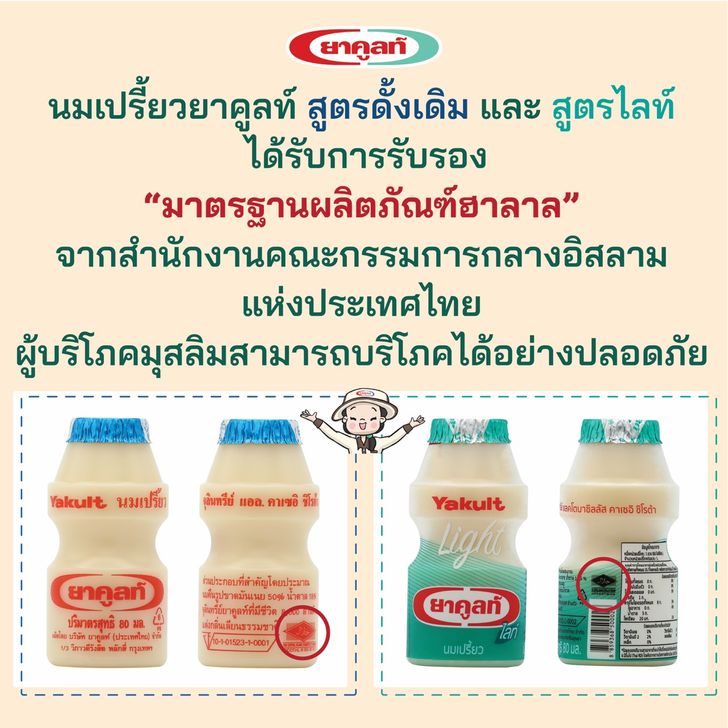 จากกรณีที่มีการส่งต่อข้อมูลจากกลุ่มบุคคลบางส่วน ในเฟสบุ๊ค และช่องทางอื่น ๆ โดยระบุว่า คณะกรรมการอิสลามได้ยกเลิกการรับรองเครื่องหมายฮาลาลสำหรับนมเปรี้ยวยาคูลท์ แล้วนั้น บริษัท ยาคูลท์ (ประเทศไทย) จำกัด ขอเรียนยืนยันว่า “นมเปรี้ยวยาคูลท์ ได้รับการรับรองมาตรฐานผลิตภัณฑ์ฮาลาล จากสำนักงานคณะกรรมการกลางอิสลามแห่งประเทศไทย” โดยมีใบรับรองรองผลิตภัณฑ์ฮาลาลอย่างชัดเจน อีกทั้ง ในผลิตภัณฑ์นมเปรี้ยวยาคูลท์ทุกขวด จะมีเครื่องหมายฮาลาล อยู่บนฉลาก ซึ่งแสดงให้เห็นว่า นมเปรี้ยวยาคูลท์ มีวัตถุดิบ และกระบวนการผลิตที่ถูกต้อง ไม่ขัดต่อหลักบัญญัติของศาสนาอิสลามอย่างเด็ดขาด