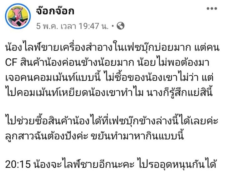 จากกรณีที่ เพจดัง "จ๊อกจ๊อก" ได้โพสต์ข้อความพร้อมรูปภาพ "น้องไลฟ์ขายเครื่องสำอางในเฟซบุ๊กบ่อยมาก แต่คน CF สินค้าน้องค่อนข้างน้อยมาก น้อยไม่พอต้องมาเจอคนคอมเม้นท์แบบนี้ ไม่ซื้อของน้องเขาไม่ว่า แต่ไปคอมเม้นท์เหยียดน้องเขาทำไม นางก็รู้สึกแย่สินี้ ไปช่วยซื้อสินค้าน้องได้ที่เฟซบุ๊กข้างล่างนี้ได้เลยค่ะ ลูกสาวฉันต้องปังค่ะ ขยันทำมาหากินแบบนี้"