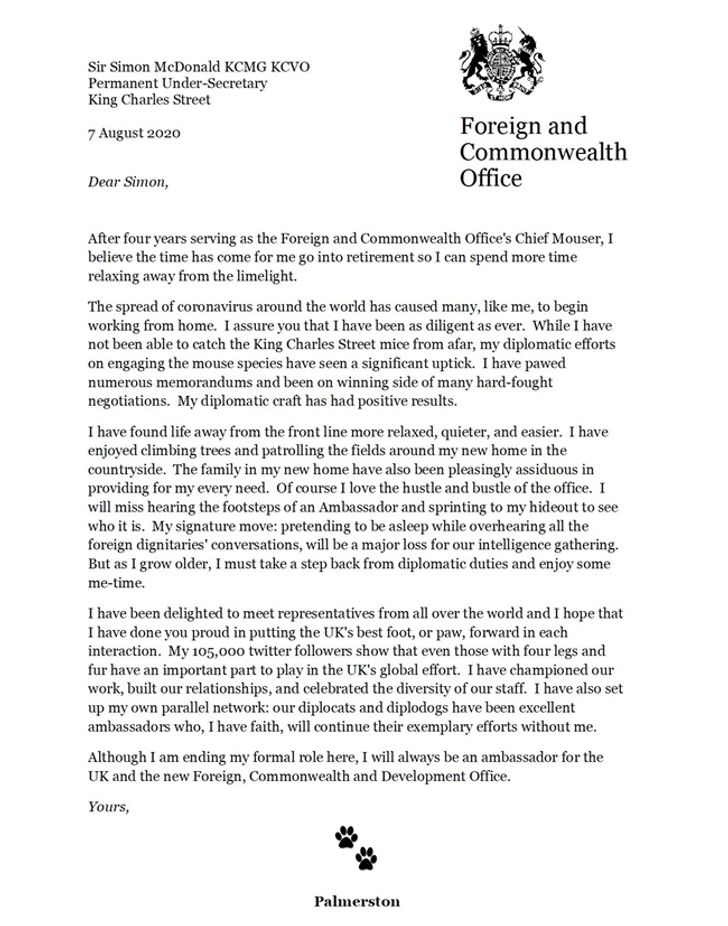 ทวิตเตอร์ของพาล์มเมอร์สตันที่มีผู้ติดตามมากกว่าหนึ่งแสนคน โพสภาพจดหมายที่พาล์มเมอร์สตัน “เขียน” ถึงเซอร์ไซมอน แม็คโดนัลด์ ปลัดกระทรวงการต่างประเทศและเครือจักรภพ ระบุว่า เขาอยากพักผ่อนให้ห่างไกลจากแสงสีเสียง และเขาชอบปีนต้นไม้ เดินเล่นในทุ่งแถวบ้านใหม่ของเขาในต่างจังหวัด