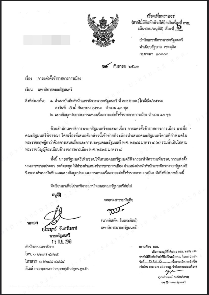 ทั้งนี้นายกรัฐมนตรีเห็นชอบให้เสนอคณะรัฐมนตรีพิจารณาให้ความเห็นชอบการแต่งตั้งนางสาวพรรณประภา ยงค์ตระกูล ให้ดำรงตำแหน่งข้าราชการการเมือง ตำแหน่งประจำสำนักเลขาธิการนายกรัฐมนตรี จึงขอส่งสำเนาบันทึกและแบบข้อมูลประกอบการเสนอ เรื่องการแต่งตั้งข้าราชการการเมือง ดังสิ่งที่ส่งมาพร้อมนี้ จึงเรียนมาเพื่อโปรดพิจารณานำเสนอคณะรัฐมนตรีต่อไป