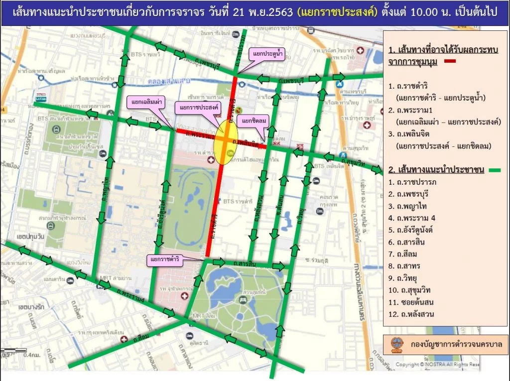 พล.ต.ต.จิรสันต์ แก้วแสงเอก รอง ผบช.น. และ พล.ต.ต.ธีระพงษ์ วงษ์รัฐพิทักษ์ ผบก.จร. ขอประชาสัมพันธ์ข่าวสารให้ประชาชนผู้ใช้รถใช้ถนนได้รับทราบ กรณีวันที่ 21 พ.ย.2563 ตามที่ปรากฏทางสื่อโซเชียลมีเดีย ได้มีประกาศนัดรวมตัวของกลุ่มผู้ชุมนุมฯ บริเวณแยกราชประสงค์ ตั้งแต่เวลา 13.00 น. ถึงเวลา 21.00 น. นั้น