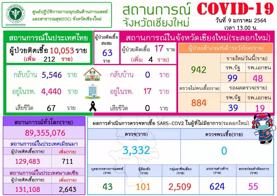 ผู้สื่อข่าวรายงานว่า วันนี้ (9 ม.ค.) เมื่อเวลา 13.00 น. สำนักงานสาธารณสุขจังหวัดเชียงใหม่รายงานสถานการณ์การแพร่ระบาดโควิด-19 ระลอกใหม่ของจังหวัดเชียงใหม่ว่า วันนี้พบผู้ป่วยติดเชื้อโควิด-19 รายใหม่เพิ่มขึ้นจำนวน 4 ราย โดยรายละเอียดจะมีการแถลงอีกครั้งในช่วงเย็น โดยกำลังอยู่ระหว่างการสอบสวนโรค