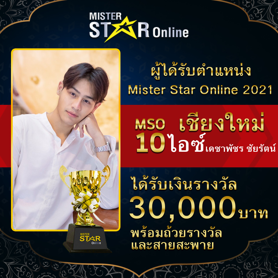 โดยหนุ่มหล่อที่ชนะการประกวด Mister star online 2021 ในครั้งนี้ ได้แก่ หนุ่ม ไอซ์-เดชาพัชร ชัยรัตน์ หนุ่มหล่อจากจังหวัดเชียงใหม่ ที่ต้องบอกว่า ทั้งหน้าตาและความสามารถที่พกมานั้นบอกเลยว่าเป็นหนุ่มที่ครบเครื่องมาก ๆ ทั้งรูปร่าง หน้าตา ความสามารถจัดว่าโดดเด่นสะดุดตา สะดุดใจกรรมการ แถมยังได้แรงเชียร์จากแฟน ๆ ที่ติดตามคอยให้กำลังใจเป็นจำนวนมาก ไม่เพียงเท่านั้น ในเรื่องของความรู้ความสามารถของหนุ่มไอซ์ ยังจัดได้ว่าอยู่ในระดับหนุ่มหล่อในฝันเลยทีเดียว เพราะการนำเสนอของหนุ่มไอซ์ ไม่ว่าจะในรูปแบบไหนก็สามารถนำเสนอได้อย่างน่าติดตาม และน่าชื่นชม เลยสามารถมัดใจกรรมการและคว้ารางวัลมาครอง นอกจากนี้ยังมีหนุ่มหล่อที่ได้ตำแหน่งต่าง ๆ ดังนี้