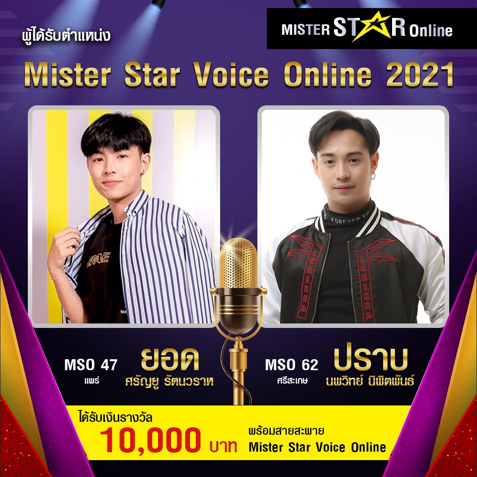 - Mister Star Voice Online 2021 จังหวัดศรีสะเกษ “ปราบ นพวิทย์ นิพิตพันธ์” และ จังหวัดแพร่ “ยอด ศรัณยู รัตนวราห”