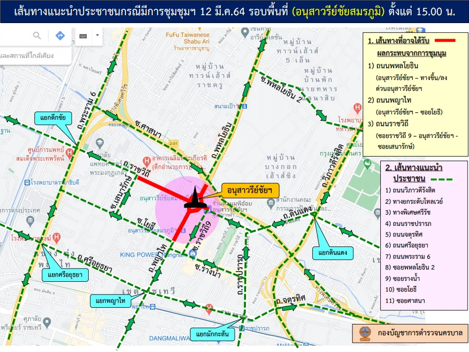 พล.ต.ต.จิรสันต์ แก้วแสงเอก รองผู้บัญชาการตำรวจนครบาล เปิดเผยว่า ตามที่ปรากฏทางสื่อโซเชียลมีเดีย ได้มีประกาศนัดรวมตัวของกลุ่มผู้ชุมนุมในบริเวณอนุสาวรีย์ชัยสมรภูมิในช่วงบ่ายวันนี้ว่า เนื่องจากอนุสาวรีย์ชัยสมรภูมิเป็นจุดปมคมนาคมสำคัญที่ประชาชนใช้ในการสัญจร ทั้งรถส่วนตัวและการใช้บริการขนส่งสาธารณะ การจราจรจึงหนาแน่นทั้งในช่วงเวลาปกติ และช่วงเวลาเร่งด่วน ดังนั้นเพื่อความสะดวก ในการเดินทางของพี่น้องประชาชน บช.น. จึงขอให้หลีกเลี่ยงเส้นทางโดยรอบอนุสาวรีย์ชัยสมรภูมิ ตั้งแต่เวลา 15.00 น. เป็นต้นไป จนเสร็จสิ้นการชุมนุมฯ ดังนี้