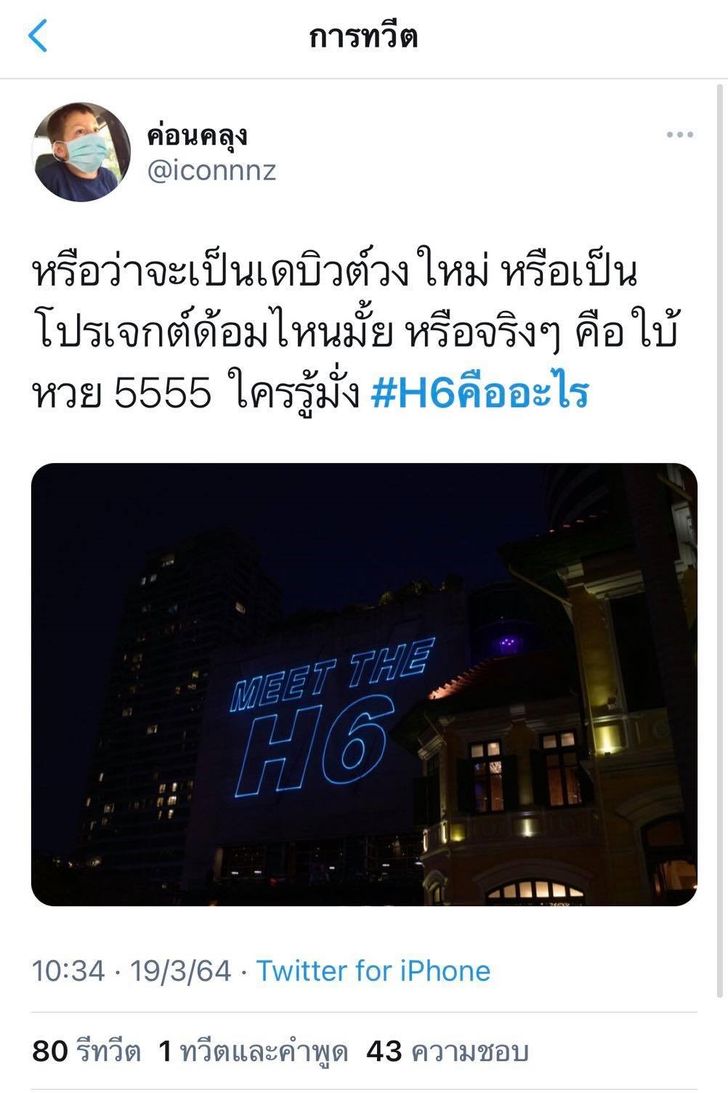 ช่วงที่ผ่านมาในสื่อ Social Media จะเห็นกระแสที่หลายคนเจอ LASER “MEET THE H6” ในหลายๆ ที่ตามตึกทั่วเมือง จนต้องถ่ายรูปมาถามกันว่ามันคืออะไรเต็มหน้า feeds กลายเป็นกระแสในสื่อออนไลน์ที่หลายคนต่างพากันคาดเดาว่าจริง ๆ แล้ว “MEET THE H6” คืออะไรกันแน่ ซึ่งก็มีการคาดเดากันไปหลายอย่าง ทั้งอาหาร ฟุตบอล ค่ายเพลง รถยนต์ ฟิตเนส เป็นต้น จน hashtag #H6คืออะไร ขึ้นอันดับหนึ่งของ twitter trends