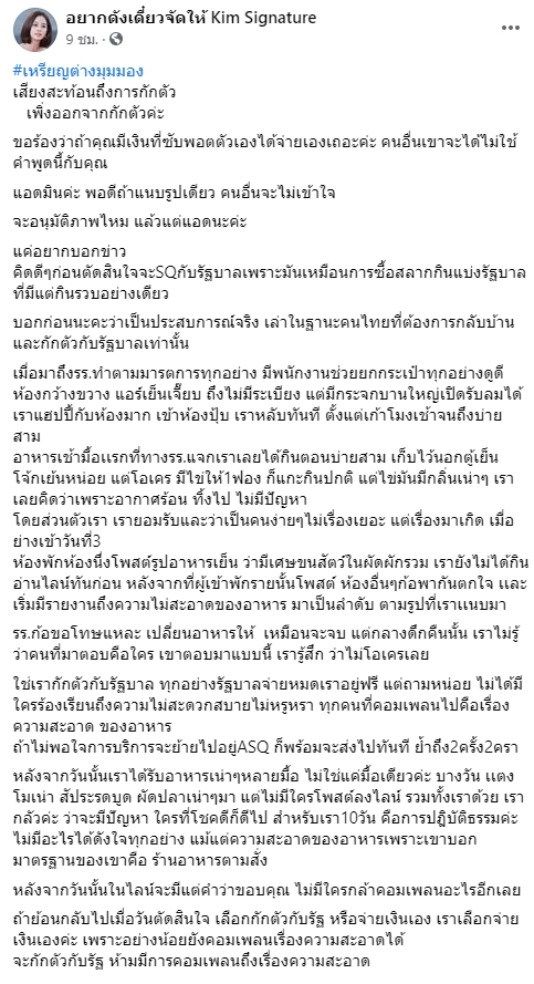 เฟซบุ๊กแฟนเพจ อยากดังเดี๋ยวจัดให้ Kim Signature ได้แชร์ข้อความจากหญิงสาวคนหนึ่ง ซึ่งเล่าประสบการณ์การกักตัวในสถานที่กักตัวที่รัฐจัดให้ (State quarantine หรือ SQ) ที่โรงแรมแห่งหนึ่ง ซึ่งพนักงานช่วยยกกระเป๋าและ สภาพห้องพักก็ปกติดี ไม่มีปัญหาอะไร