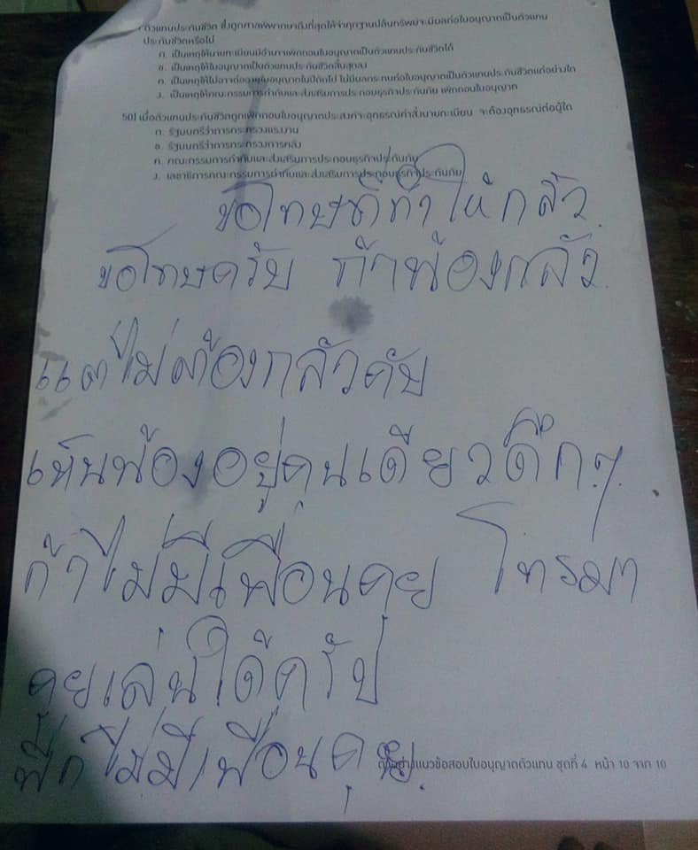 ต่อมาก็มีกระดาษใบที่สองสอดเข้ามาอีกว่า “ขอโทษที่ทำให้กลัว ขอโทษครับ ถ้าน้องกลัว แต่ไม่ต้องกลัว เห็นน้องอยู่คนเดียวดึกๆ ถ้าไม่มีเพื่อนคุยโทรมาคุยเล่นได้ครับ พี่ก็ไม่มีเพื่อนคุย”