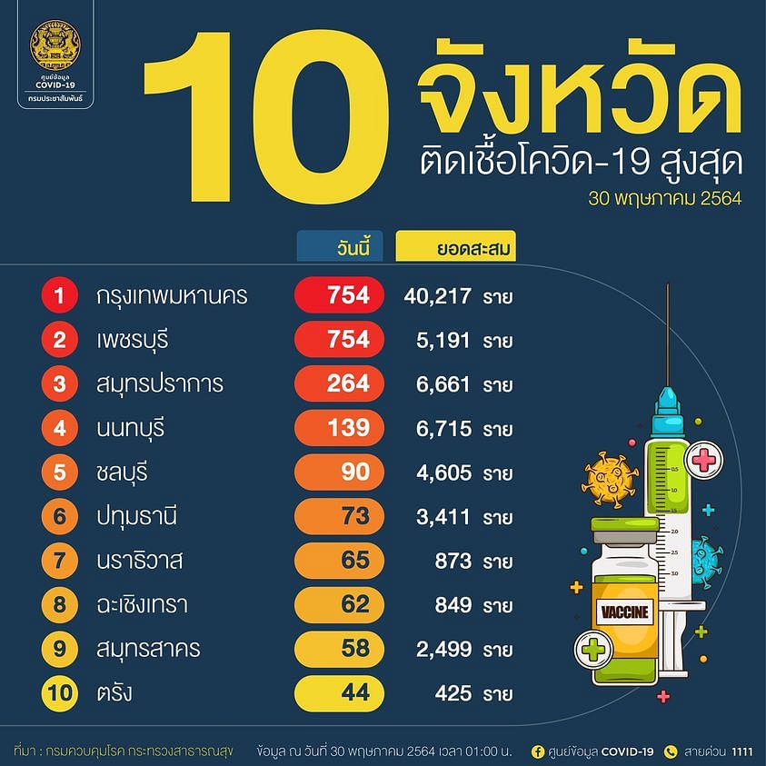 ศูนย์บริหารสถานการณ์แพร่ระบาดของโรคติดเชื้อไวรัสโคโรนา 2019 หรือ ศบค. เปิด 10 จังหวัด ติดเชื้อโควิด สูงสุด วันนี้ 30 พฤษภาคม 2564