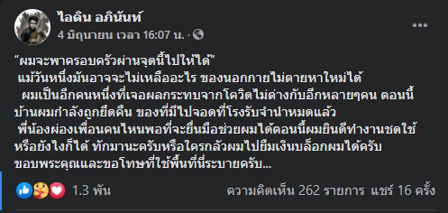 โดย ไอดิน ได้โพสต์ข้อความลงในเฟซบุ๊กระบายสถานการณ์ชีวิตในตอนนี้ว่า "ผมจะพาครอบครัวผ่านจุดนี้ไปให้ได้" แม้วันหนึ่งมันอาจจะไม่เหลืออะไร ของนอกกายไม่ตายหาใหม่ได้ ผมเป็นอีกคนหนึ่งที่เจอผลกระทบจากโควิดไม่ต่างกับอีกหลายๆ คน