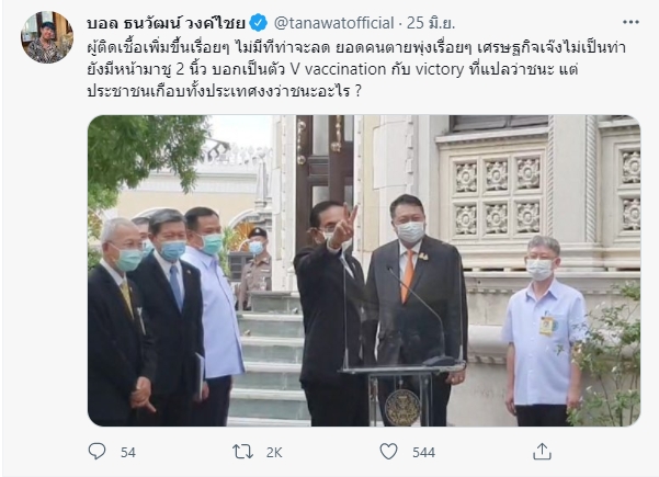 นายธนวัฒน์ วงค์ไชย หรือ บอล นักเคลื่อนไหวทางการเมือง ออกมาวิจารณ์ถึงกรณีดังกล่าวว่า การที่บอกว่าชู 2 นิ้วคือ Vaccination (การฉีดวัคซีน) กับ Victory (ชัยชนะ) ทำให้ประชาชนทั้งประเทศ งง ว่าชนะอะไร เพราะยอดติดเชื้อก็เพิ่มขึ้นเรื่อยๆ เศรษฐกิจก็พัง