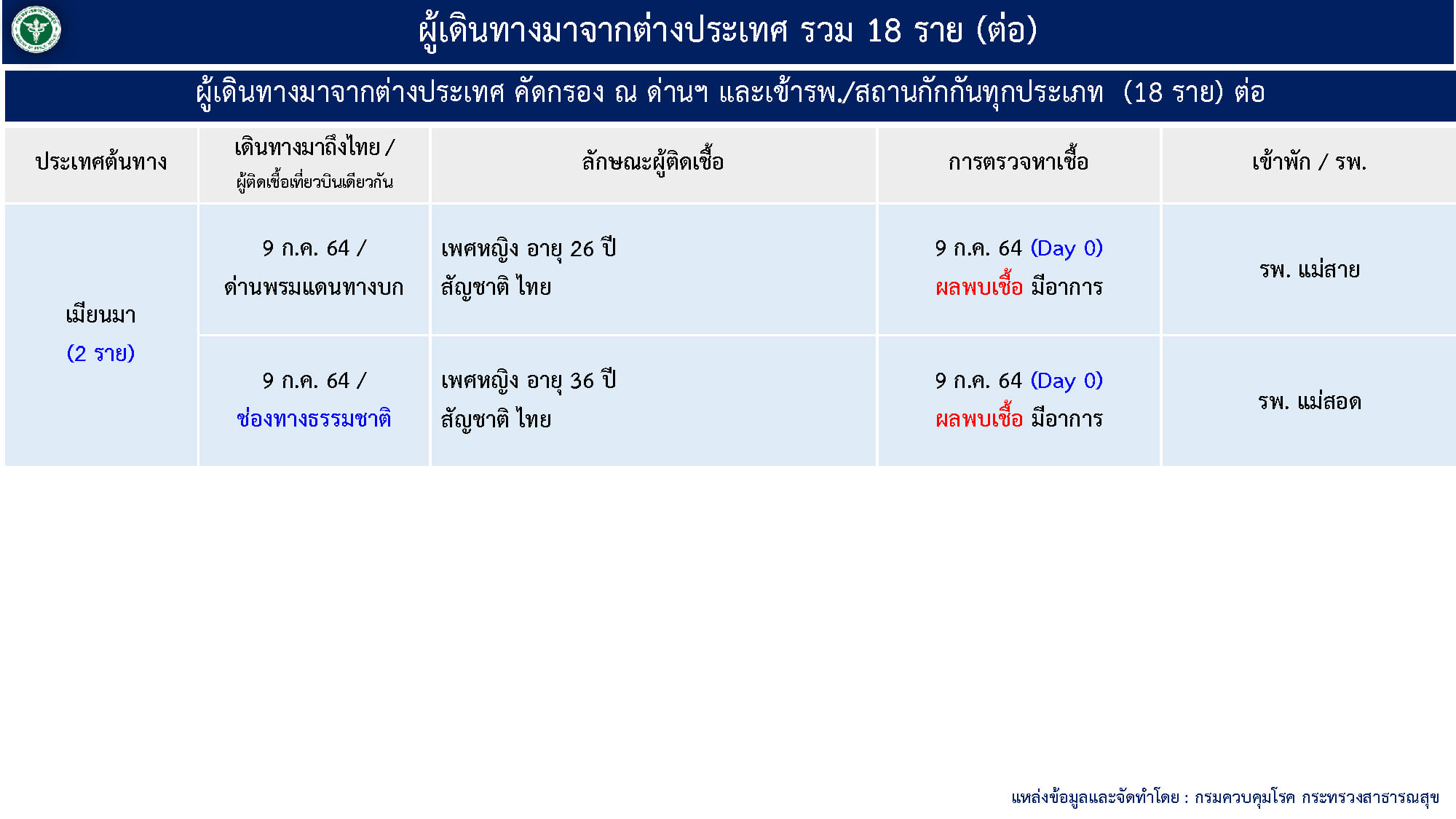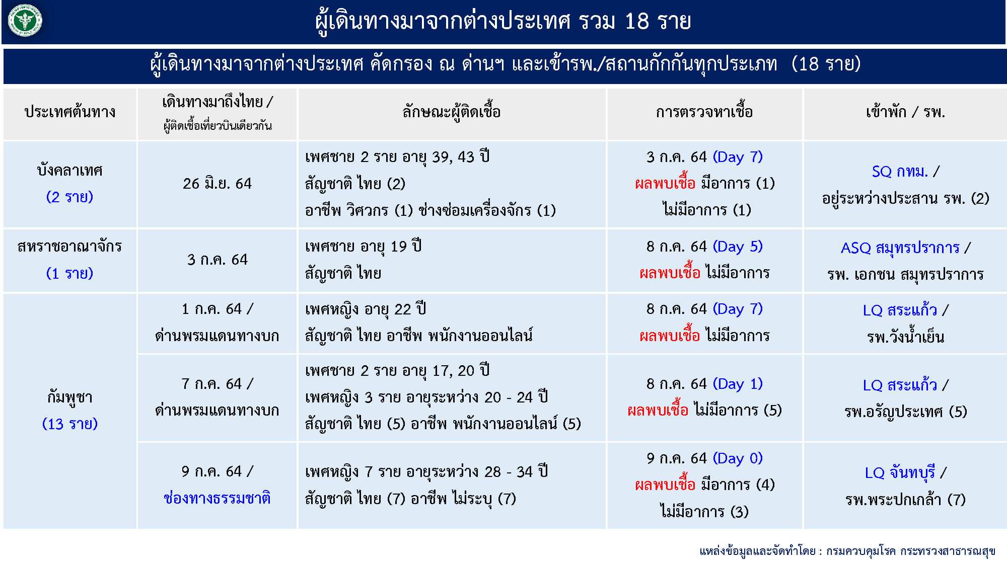 หมายเหตุ : อัปเดตข้อมูล เวลา 12.30 น. จากการแถลงของศูนย์บริหารสถานการณ์การแพร่ระบาดของโรคติดเชื้อไวรัสโคโรนา 2019 (ศบค.)