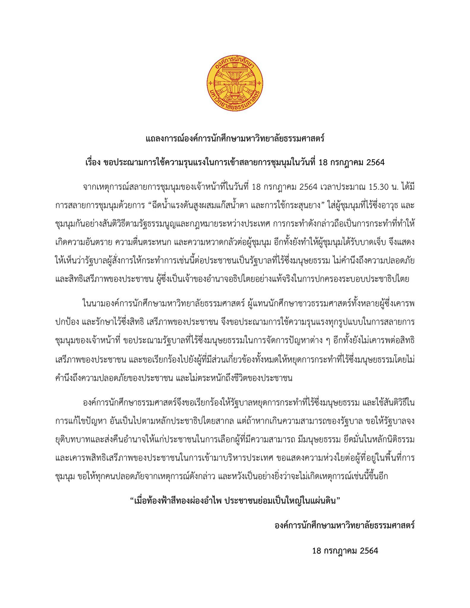 เมื่อวันที่ 18 กรกฎาคม 2564 องค์การนักศึกษามหาวิทยาลัยธรรมศาสตร์ ได้ออกแถลงการณ์องค์การนักศึกษามหาวิทยาลัยธรรมศาสตร์ เรื่อง ขอประณามการใช้ความรุนแรงในการเข้าสลายการชุมนุมในวันที่ 18 กรกฎาคม 2564 โดยมีรายละเอียดว่า
