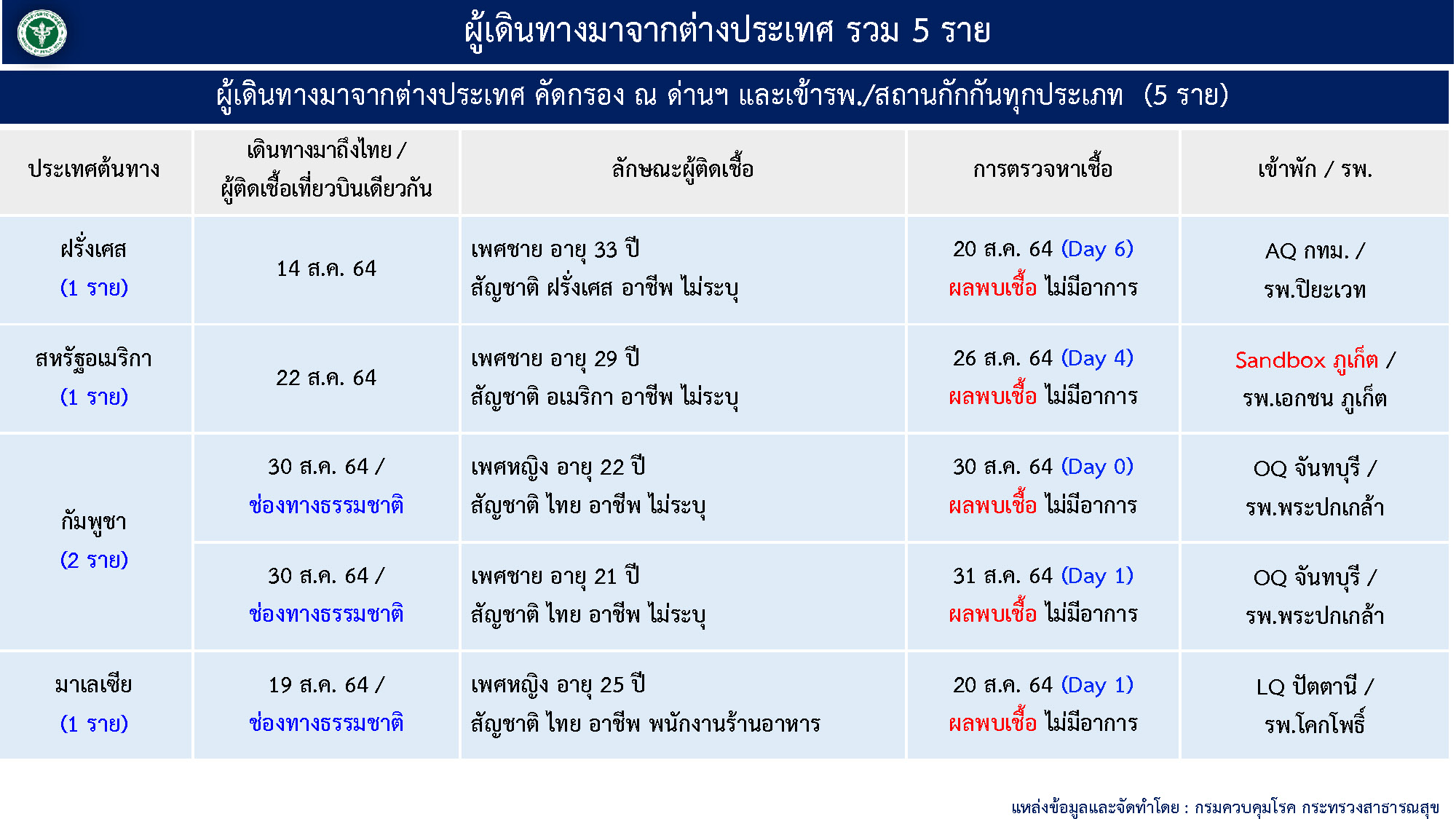 4.เดินทางมาจากต่างประเทศ และเข้า State Quarantine 5 ราย