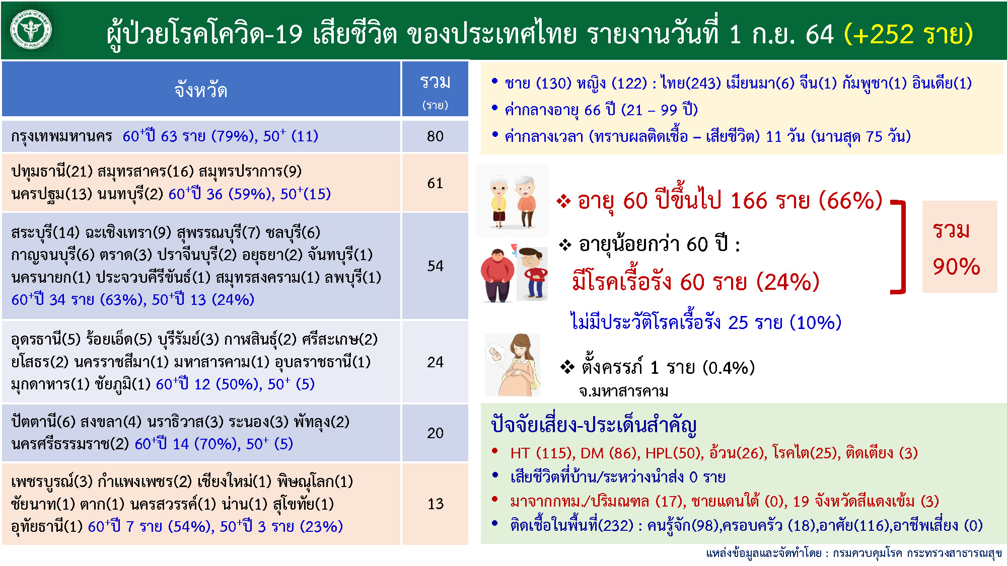 รายละเอียดผู้เสียชีวิตของประเทศไทยวันพุธที่ 1 กันยายน 2564 จำนวน 252 ราย