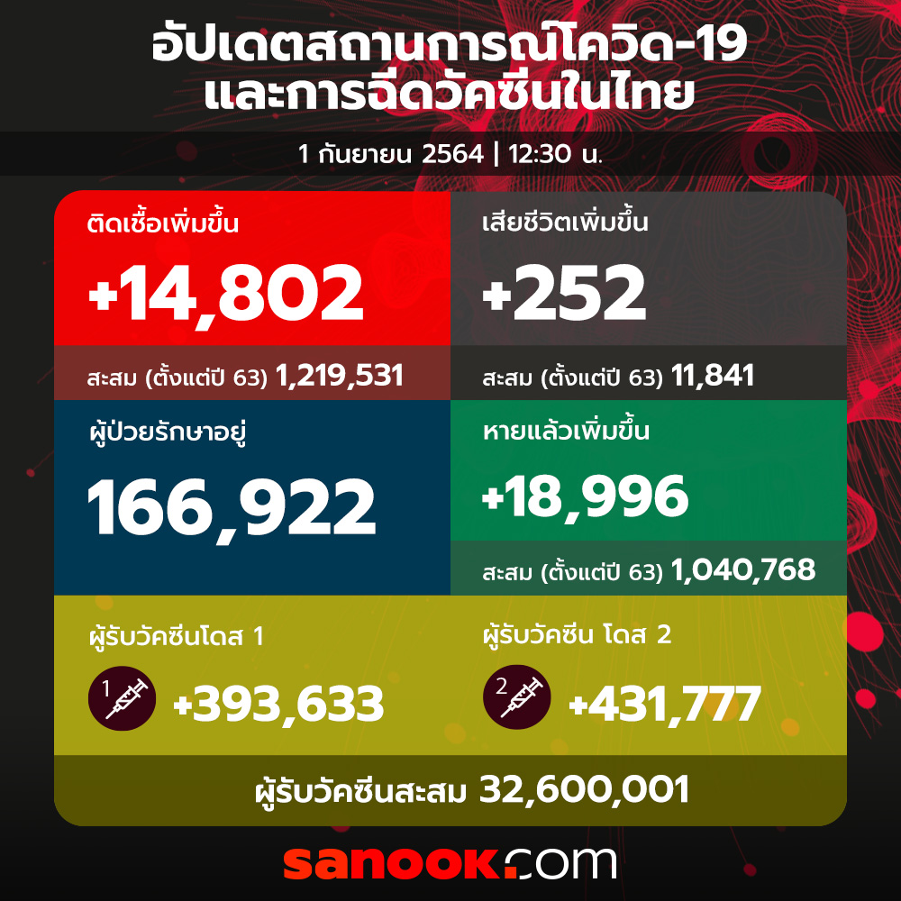 โควิดวันนี้ พบติดเชื้อเพิ่ม 14,802 ราย เสียชีวิต 252 ราย หายป่วย 18,996 ราย