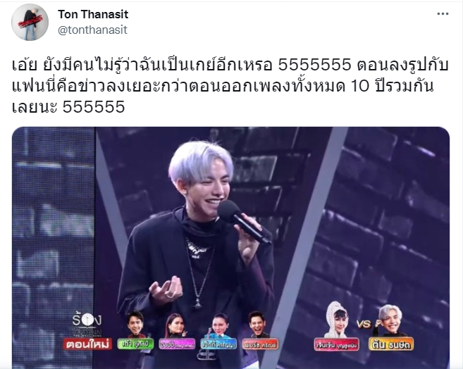 พร้อมกับข้อความว่า "เอ้ย ยังมีคนไม่รู้ว่าฉันเป็นเกย์อีกเหรอ 5555555 ตอนลงรูปกับแฟนนี่คือข่าวลงเยอะกว่าตอนออกเพลงทั้งหมด 10 ปีรวมกันเลยนะ 555555"