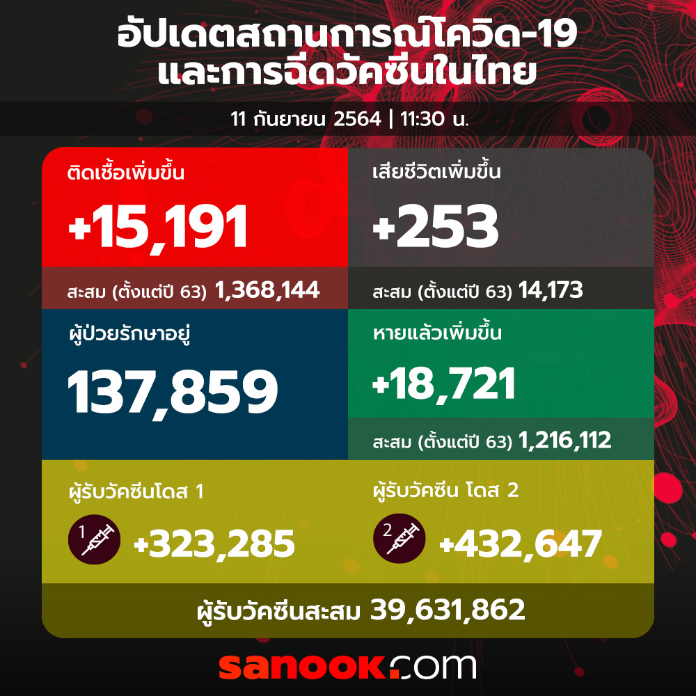 โควิดวันนี้ ติดเชื้อเพิ่ม 15,191 ราย เสียชีวิต 253 ราย หายป่วย 18,721 ราย
