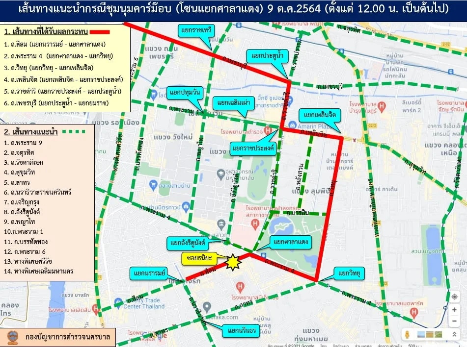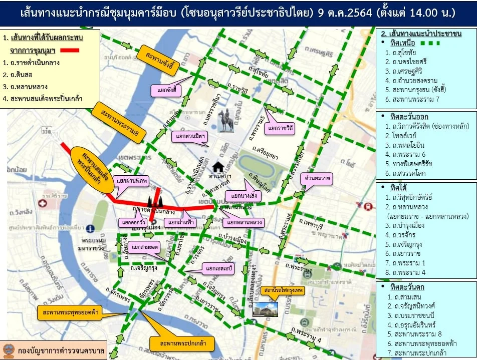 เนื่องด้วย บริเวณการรวมกลุ่มเพื่อชุมนุมฯ และเส้นทางในการเคลื่อนขบวนดังกล่าวเป็นเส้นทางสำคัญที่ประชาชนใช้ในการสัญจร ดังนั้น เพื่อให้เกิดความสะดวกในการเดินทางของพี่น้องประชาชน บช.น. จึงขอแจ้งข้อมูลข่าวสารต้านการจราจร เพื่อประกอบในการวางแผนการเดินทาง และขอให้หลีกเลี่ยงเส้นทางตั้งแต่เวลา 12.00 น. เป็นต้นไปจนเสร็จสิ้นการชุมนุมฯ ดังนี้