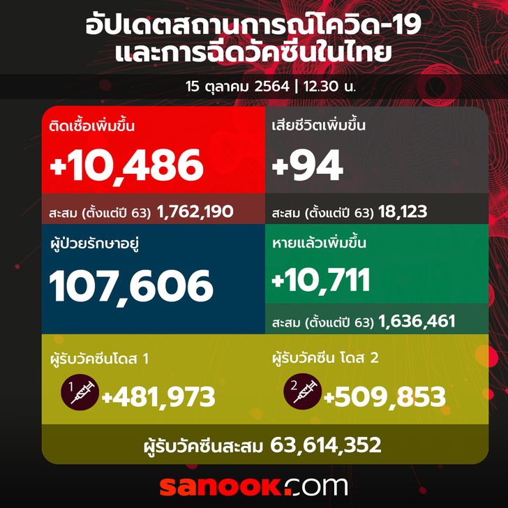 ยังคาอยู่หลักหมื่น! โควิดวันนี้ ไทยพบติดเชื้อเพิ่ม 10,486 ราย เสียชีวิตอีก 94 ราย
