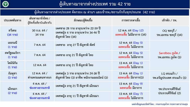 หมายเหตุ : อัปเดตข้อมูลเมื่อเวลา 12.30 น. จากการแถลงของศูนย์บริหารสถานการณ์การแพร่ระบาดของโรคติดเชื้อไวรัสโคโรนา 2019 (ศบค.)