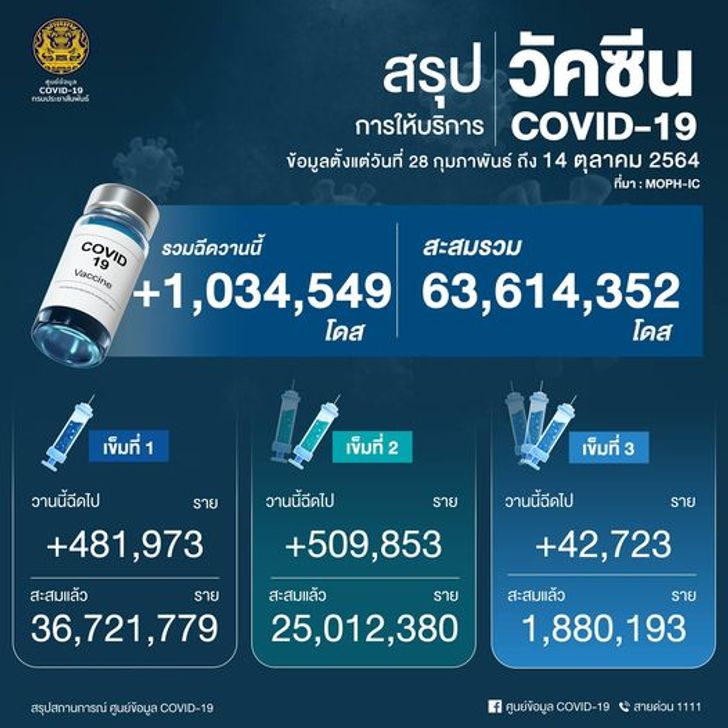 จำนวนการได้รับวัคซีนสะสม (28 ก.พ. - 14 ต.ค. 2564) รวม 63,614,352 โดส ใน 77 จังหวัด