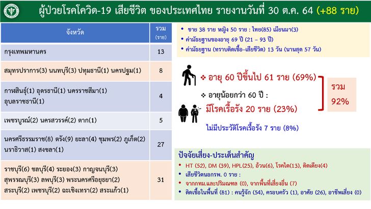รายละเอียดผู้เสียชีวิตของประเทศไทยวันเสาร์ที่ 30 ตุลาคม 2564 จำนวน 88 ราย