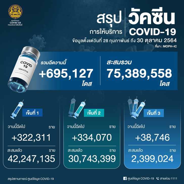 จำนวนการได้รับวัคซีนสะสม (28 ก.พ. - 30 ต.ค. 2564) รวม 75,389,558 โดส ใน 77 จังหวัด
