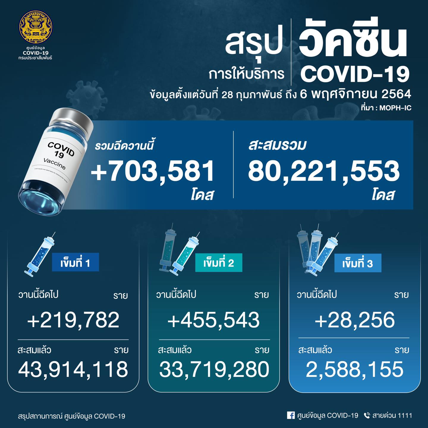จำนวนการได้รับวัคซีนสะสม (28 ก.พ. - 6 พ.ย. 2564) รวม 80,221,553 โดส ใน 77 จังหวัด