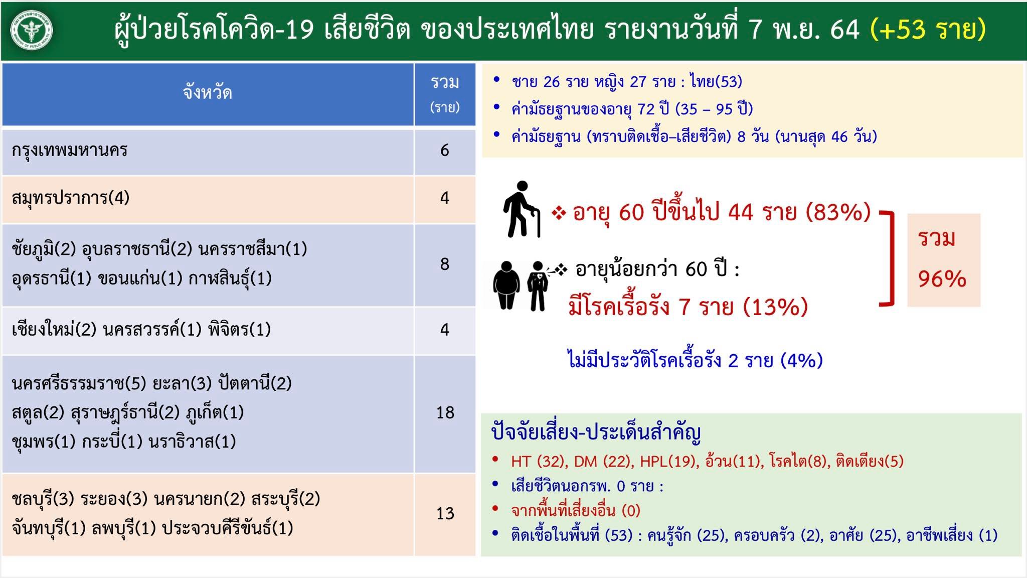 วันนี้ (ุ7 พ.ย.) เมื่อเวลา 07.30 น. ศูนย์ปฏิบัติการภาวะฉุกเฉิน กรมควบคุมโรค กระทรวงสาธารณสุข เผยตัวเลขสถานการณ์การแพร่ระบาดของโควิด-19 ในประเทศไทย ว่า