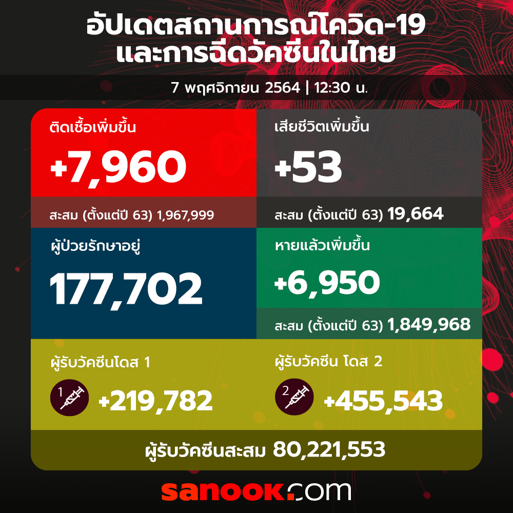 ลดลงมาอีกนิด โควิดวันนี้ ไทยพบผู้ติดเชื้อเพิ่ม 7,960 ราย เสียชีวิต 53 ราย