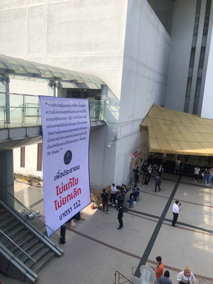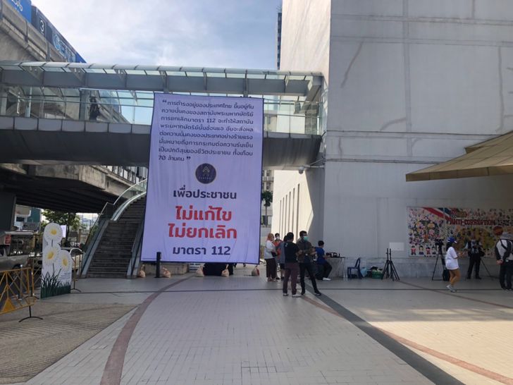 บรรยากาศบริเวณหน้าหอศิลปวัฒนธรรมแห่งกรุงเทพมหานคร หลังมีการนัดทำกิจกรรมของกลุ่มไทยรักษา ที่นัดทำกิจกรรมเปิดโต๊ะเข้าชื่อ ไม่แก้ไข ไม่ยกเลิก มาตรา 112 ตั้งแต่เวลา 16.00 น.-18.30 น. ซึ่งมีการนำป้ายขนาดใหญ่มาติดบริเวณสะพานสะกายวอร์คที่ระบุข้อความว่า “การดำรงอยู่ของประเทศไทยขึ้นอยู่กับความมั่นคงของสถาบันพระมหากษัตริย์ การยกเลิกมาตรา 112 จะทำให้สถาบันพระมหากษัตริย์นั้นอ่อนแอ อันจะส่งผลต่อความมั่นคงของประเทศอย่างร้ายแรง นั่นหมายถึงการกระทบต่อความร่มเย็นเป็นปกติสุขของชีวิตประชาชน ทั้งเกือบ 70 ล้านคน เพื่อประชาชน ไม่แก้ไข ไม่ยกเลิก มาตรา 112”