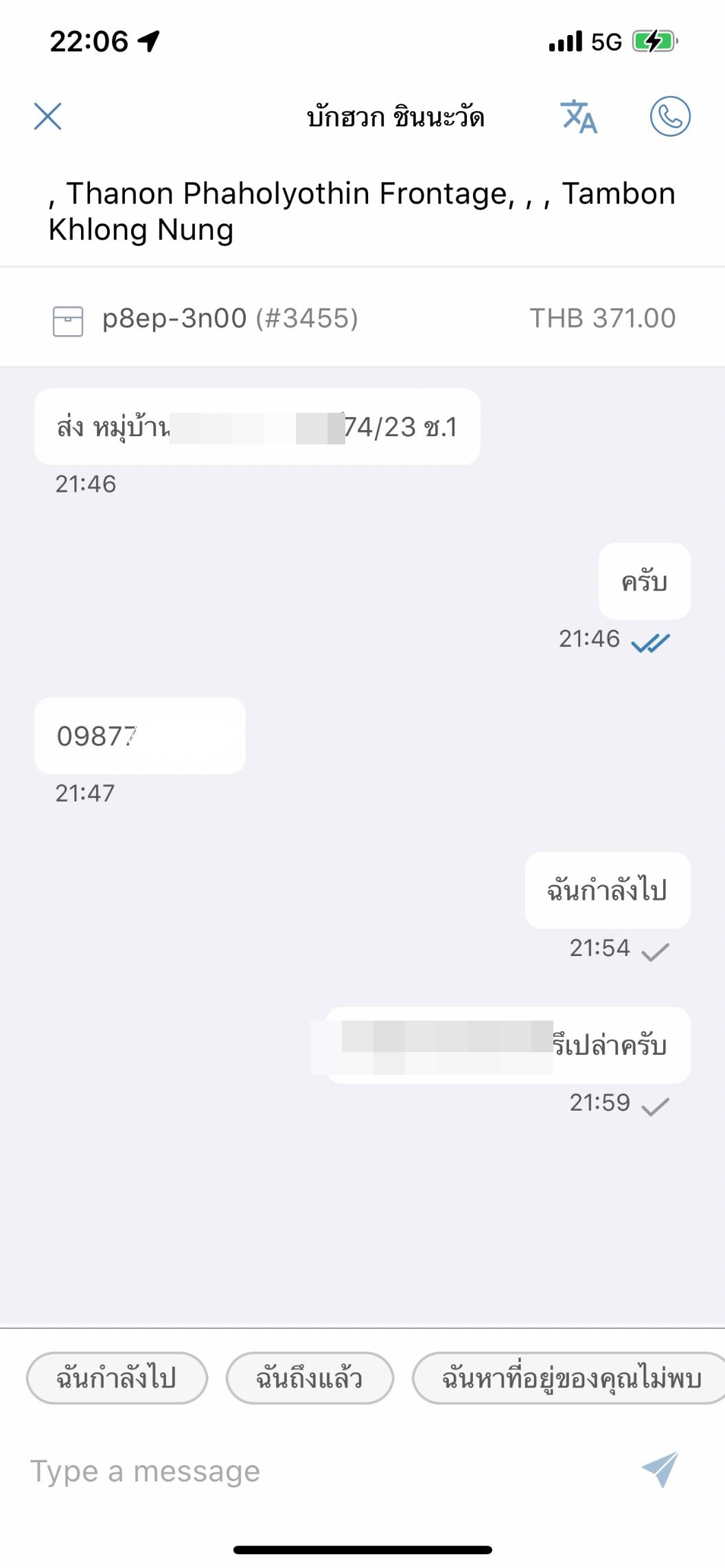 และหลังจากที่กดรับ “บุคคลปริศนา” ก็ได้ส่งข้อความมาหาผมทันทีที่กดรับออเดอร์ ตามในรูปด้านล่างพร้อมเบอร์โทรเสร็จสรรพ หลังจากที่ได้ข้อมูลมาเรียบร้อยก็ไปรอออเดอร์จนเสร็จ แล้วขับรถมาจนถึงหน้าหมู่บ้านแห่งนี้ (คนขับโซนนี้น่าจะรู้ดี) พอมาถึงหน้าหมู่บ้านก็จะเจอ รปภ. ก็เริ่มบทสนทนา