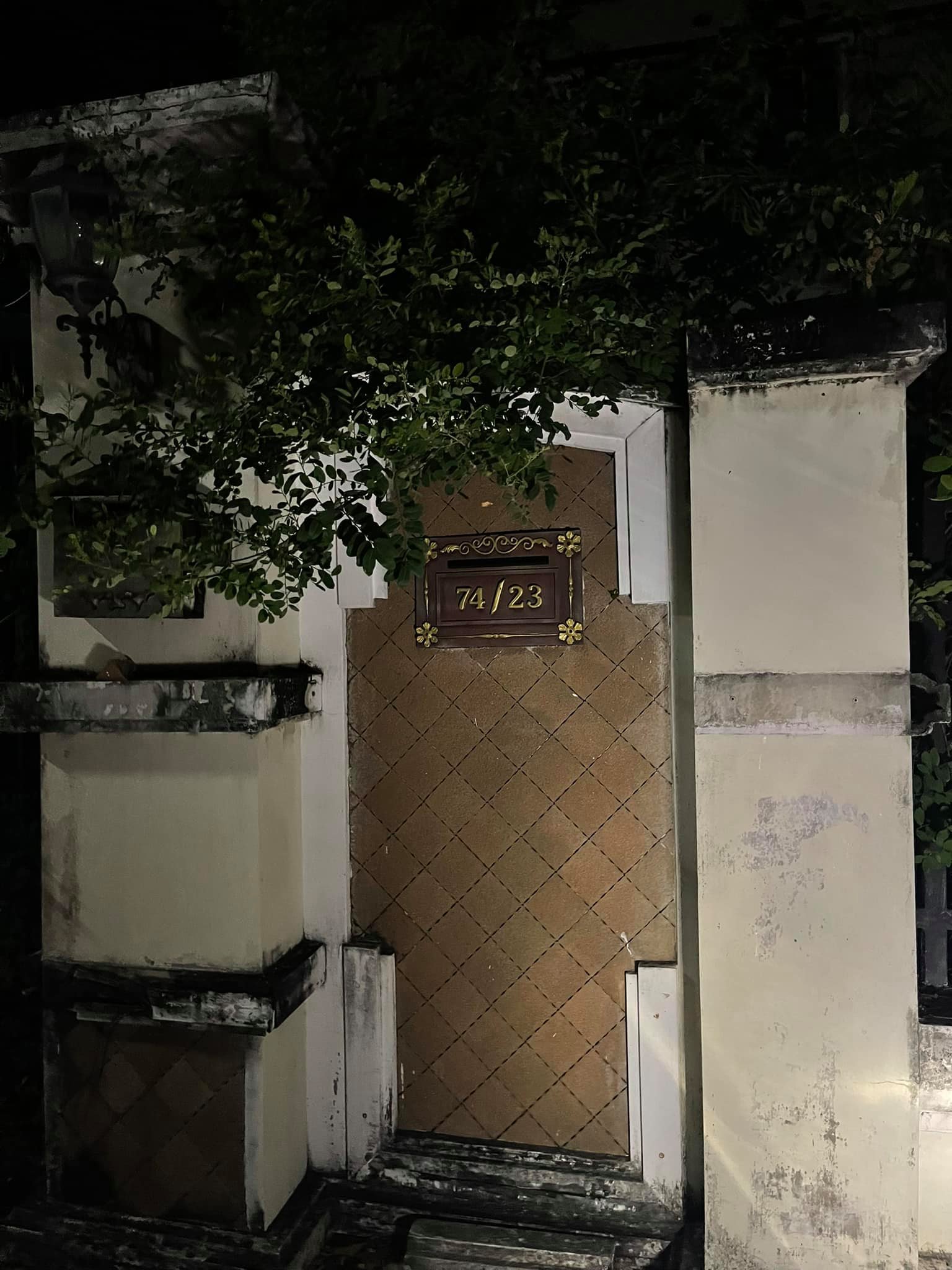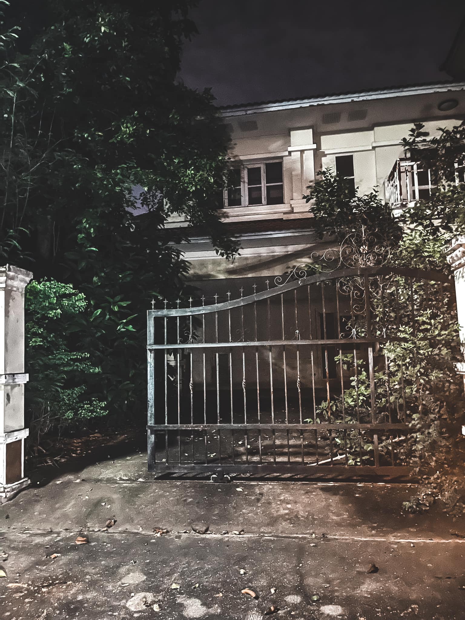 ตอนกำลังจะไปถึงหน้าบ้านคือลมแรงมากแบบคิดว่าพายุกำลังจะเข้า พอไปถึงหน้าบ้านก็เป็นสภาพแบบที่เห็นเลยครับ บ้านที่เต็มไปด้วยต้นไม้ผุพัง เก่า (บรรยากาศจริงจะมืดกว่านี้มาก แต่เพราะโทรศัพท์มันปรับแสงเองเลยได้ภาพที่สว่าง) ผมเลยรีบถ่ายรูป รีบออกจากตรงนี้ด่วนๆ คือไม่ไหวเลย ขนลุกตลอดเวลา พี่รปภ ก็ขนลุกเหมือนกับผมไม่แพ้กัน
