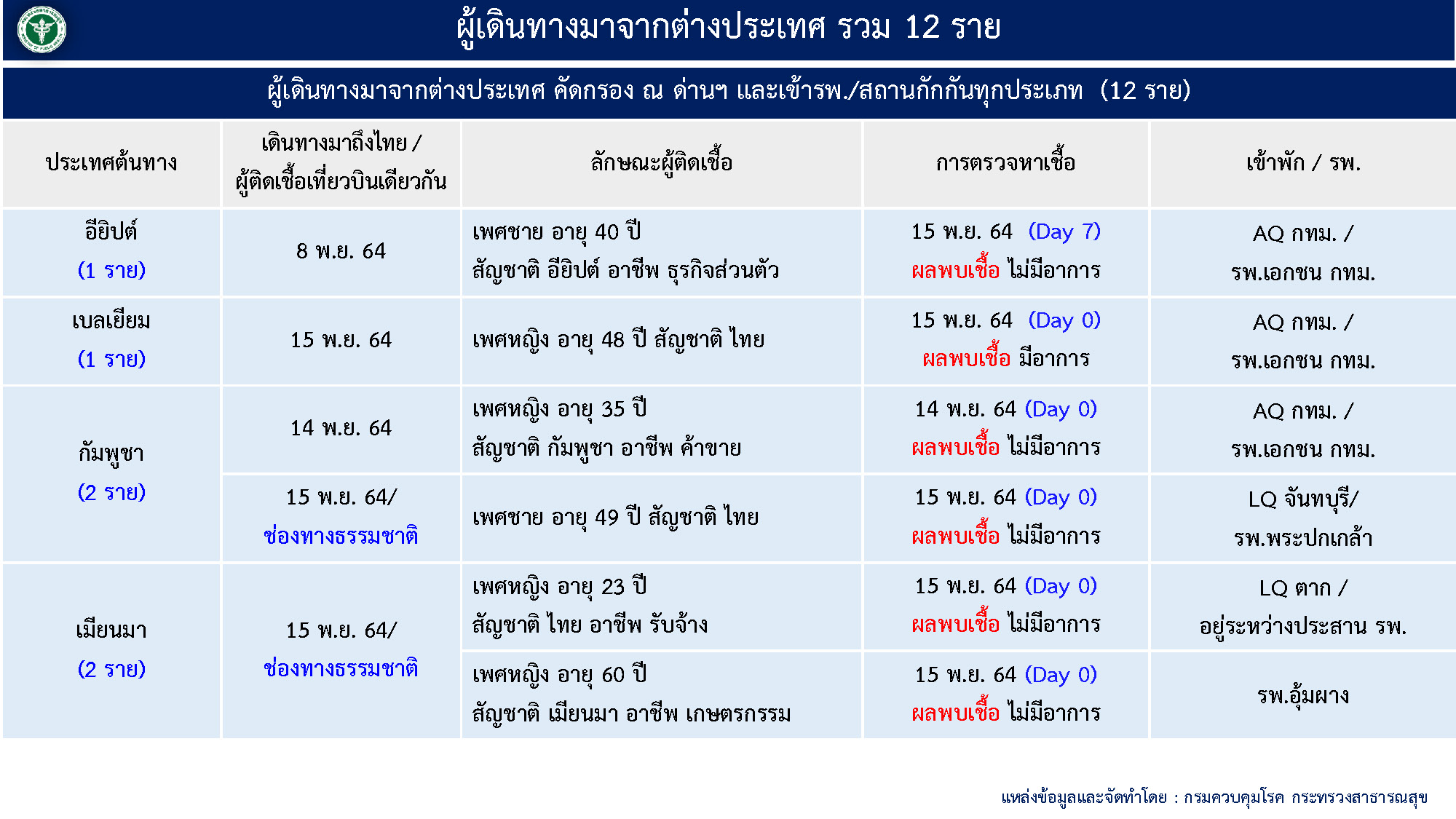 - ผู้ป่วยมาจากต่างประเทศ 12 ราย