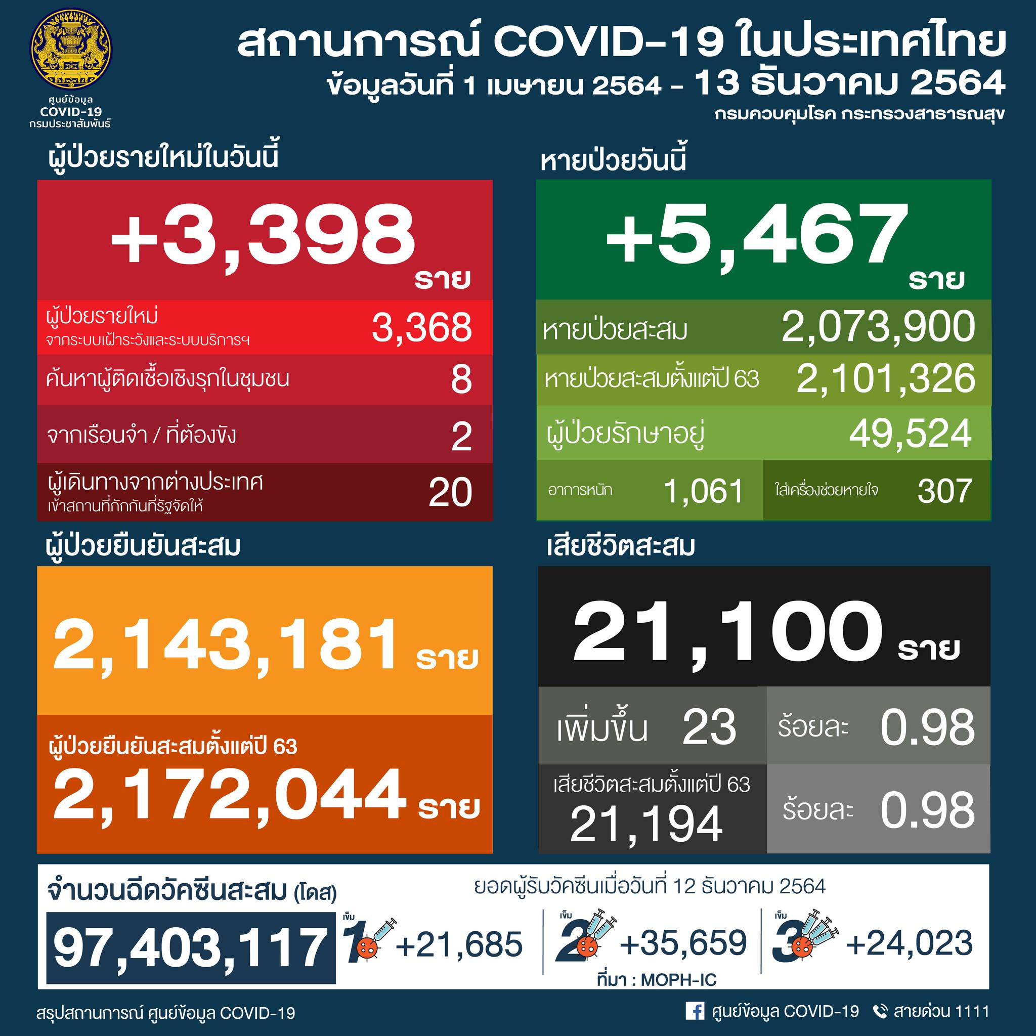 จำนวนการได้รับวัคซีนสะสม (28 ก.พ. - 12 ธ.ค. 2564) รวม 97,403,117 โดส ใน 77 จังหวัด