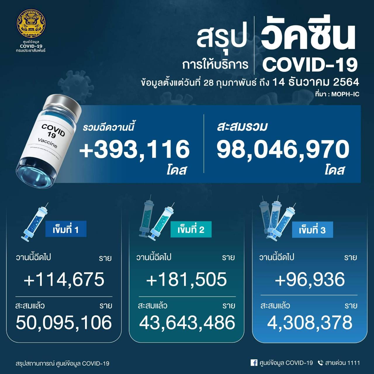 ภาพรวมยอดฉีดวัคซีน วันที่ 14 ธันวาคม 2564 ยอดฉีดทั่วประเทศ 393,116 โดส