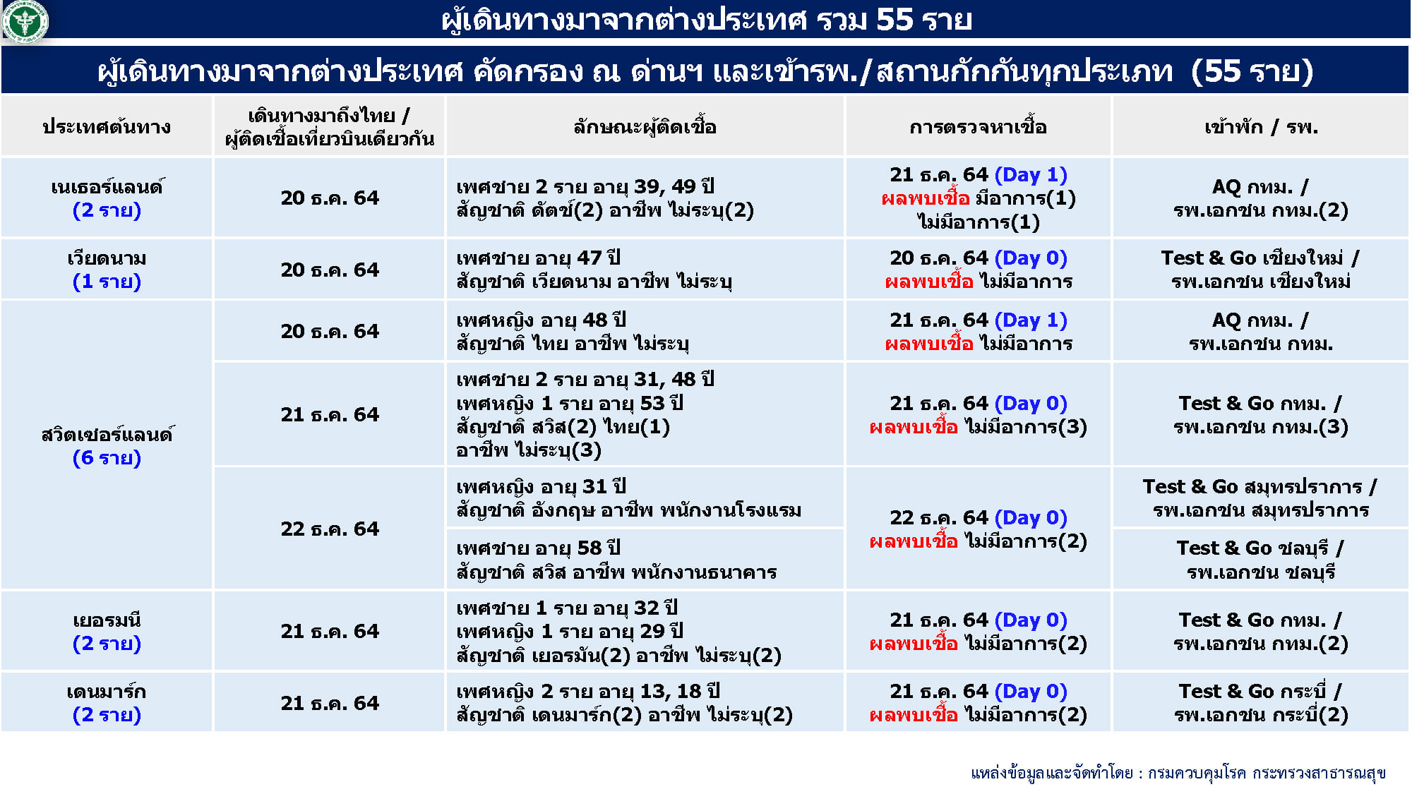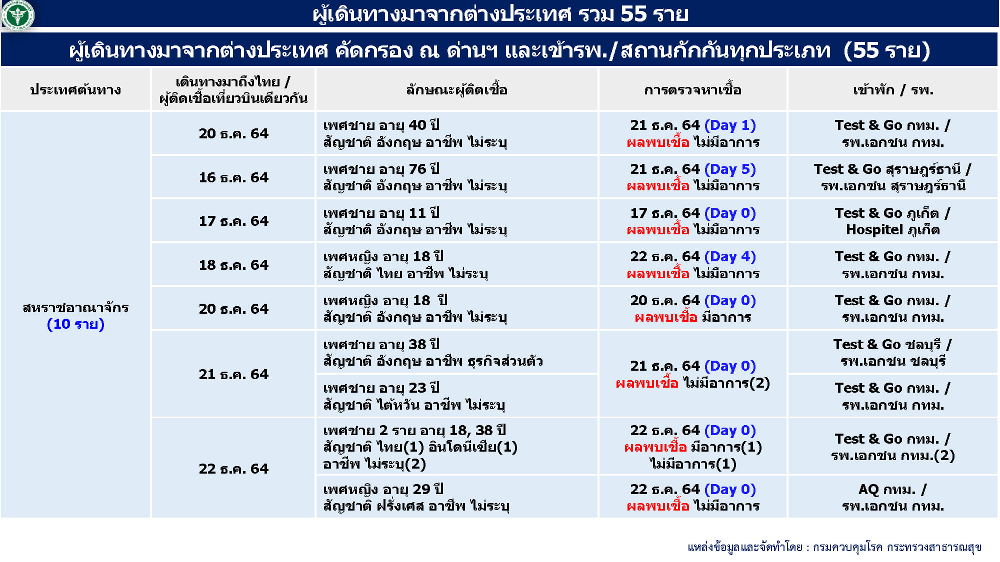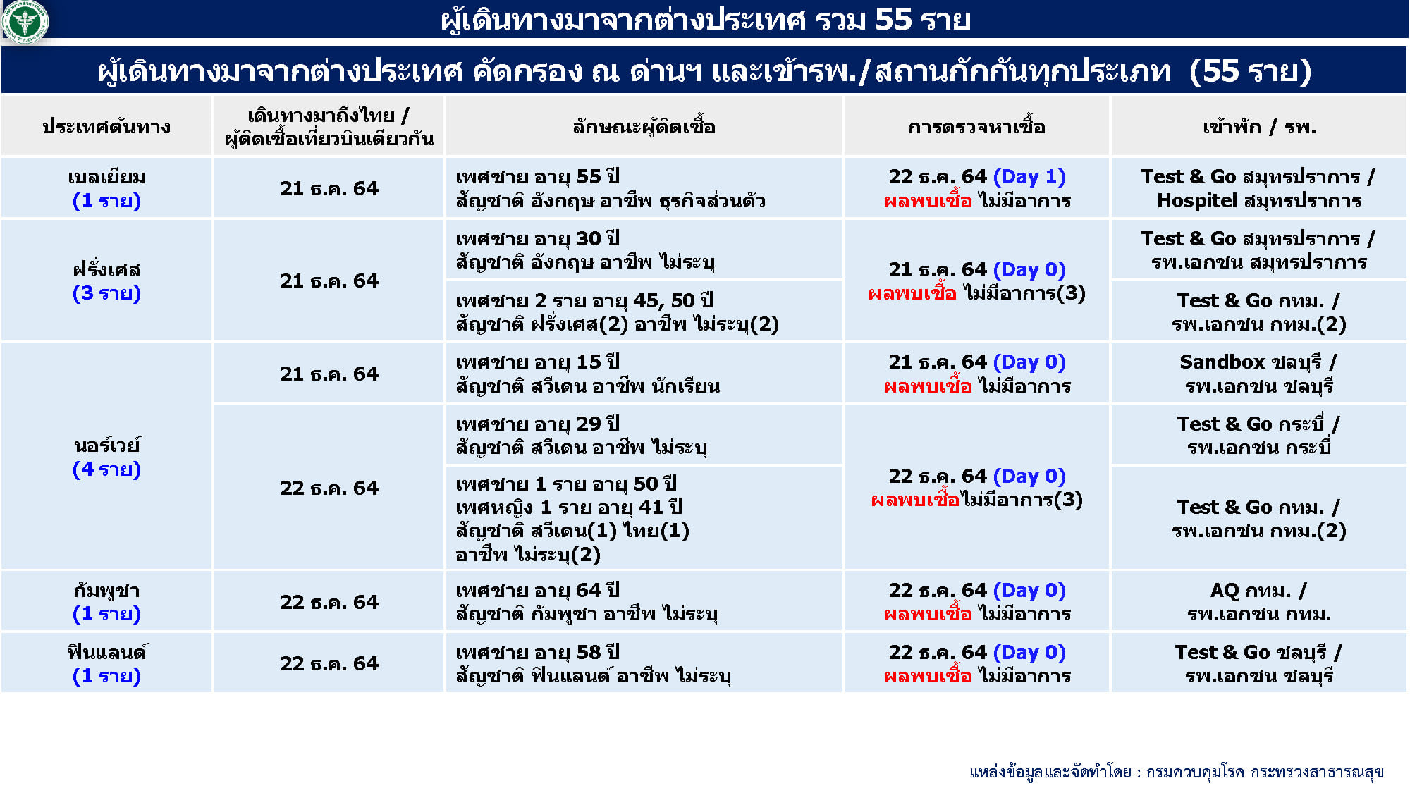 - ผู้ป่วยมาจากต่างประเทศ 55 ราย