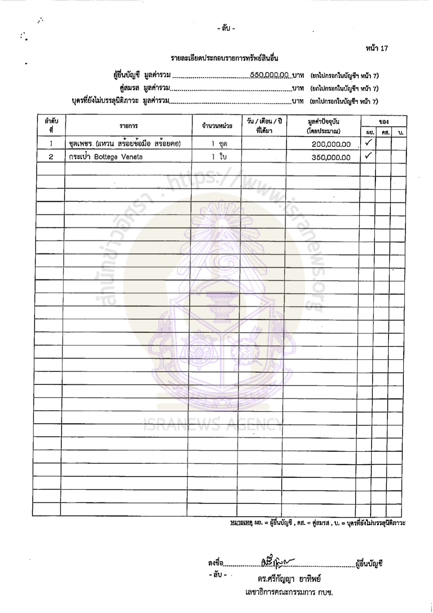 วันนี้ (25 ธ.ค.) สำนักข่าวอิศรา รายงานว่า นางศรีกัญญา ยาทิพย์ เลขาธิการคณะกรรมการกองทุนบำเหน็จบำนาญข้าราชการ (กบข.) ได้แจ้งบัญชีแสดงรายการทรัพย์สินและหนี้สิน ต่อ สำนักงานคณะกรรมการป้องกันและปราบปรามการทุจริตแห่งชาติ (ป.ป.ช.) เมื่อวันที่ 14 ตุลาคม 2564 ที่ผ่านมา โดยพบว่าในรายการ ทรัพย์สินอื่น มีระบุไว้จำนวน 2 รายการ คือ ชุดเพชร (แหวน สร้อยข้อมือ สร้อยคอ) 1 ชุด มูลค่า 200,000 บาท และ กระเป๋า Bottega Veneta 1 ใบ มูลค่า 350,000 บาท