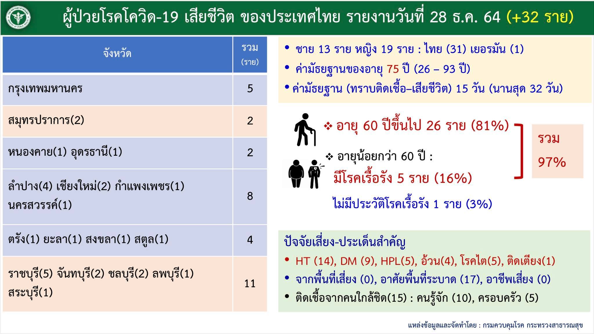 รายละเอียดผู้เสียชีวิตของประเทศไทยวันอังคารที่ 28 ธันวาคม 2564 จำนวน 32 ราย